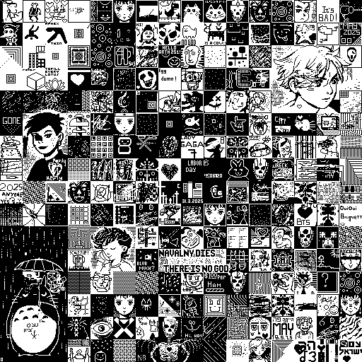 thing you'll encounter is a page with an image like this: It should be noted that glyph imagery is nothing new. Mayans and Egyptians used glyphs, and the word 'glyph' comes from (ancient?) Greek ('carving'). More recently, there is the work of Kenneth Knowlton, who in the 1960's used computers at Bell Labs to create images composed of glyphs. I first encountered one of Knowlton's pictures -- which seemed to combine Chuck Close and the teletype -- at the School of Visual Arts in the early 1990s. The present project does, however, shift the focus of authorship. It is an image-making system that can be altered from all over the Internet. It's not clear who owns the collaborative image. For my part, I encourage you to use it any way you see fit. I look forward to seeing what images develop. Finally, if you don't like the options given to you, please revise the source code. Copy it. Steal it. Share it. Print it. Pretend it's yours. I don't care.